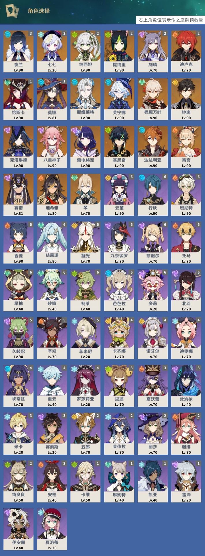 【终身找回包赔】【ISW0X1F2B】60级,64黄,女主,21个五星角色:3命夜兰,3命七七,2命纳西妲,2命提纳里,2命刻晴,2命迪卢克,1命恰斯卡,1命莫娜,那维莱特,芙宁娜,枫原万叶,钟离,克