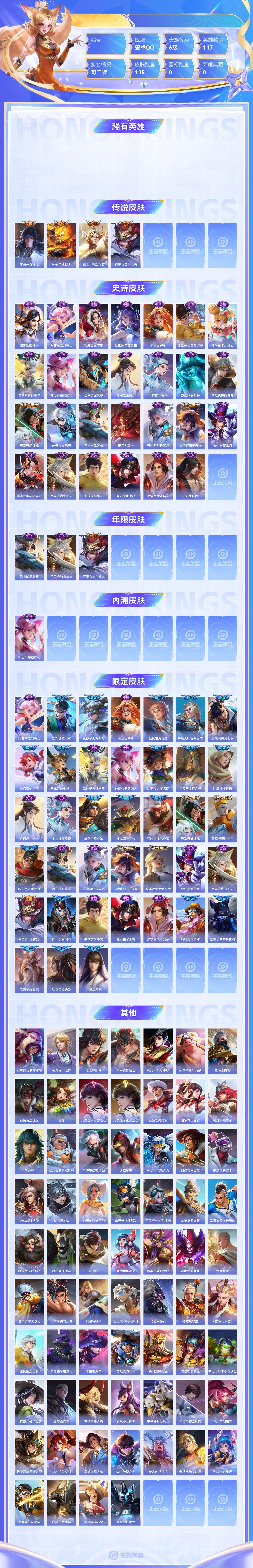【终身找回包赔】【6J6V31HH2】传说4史诗27限定38英雄117皮肤115稀有英雄8贵族6级皮肤价值:67192 【传说皮肤4】李信一念神魔孙悟空地狱火花木兰冠军飞将百里玄策白虎志 【史诗皮肤2