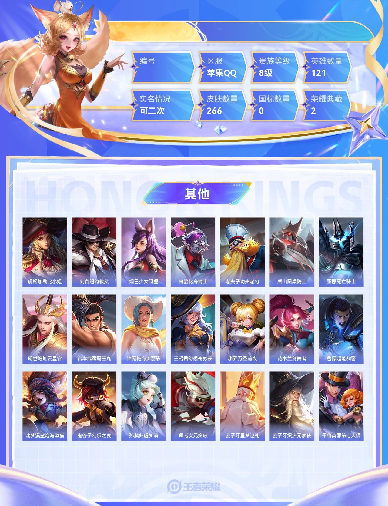 【终身找回包赔】【6K9NWGCE2】珍品传说1无双4典藏2传说11史诗57限定87英雄121皮肤266稀有英雄8贵族8级皮肤价值:187066 【珍品传说1】孙策时之奇旅 【无双皮肤4】瑶真我赫兹甄