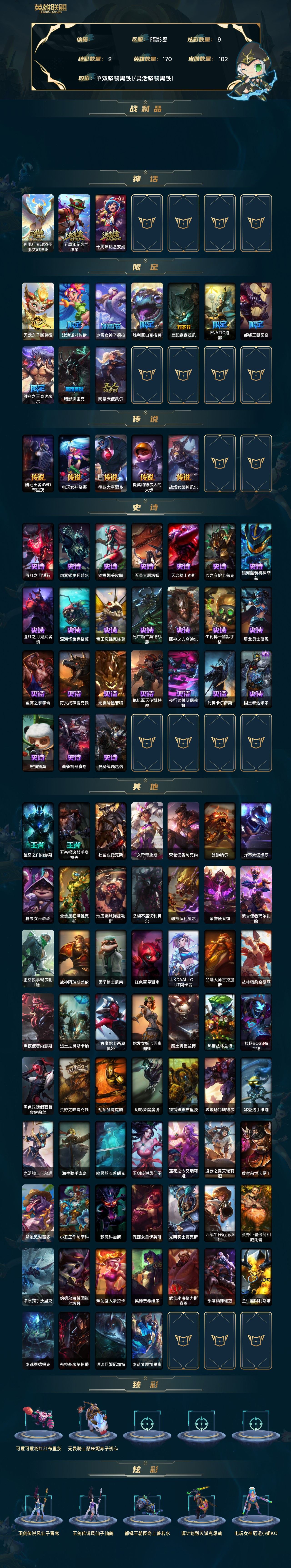 【终身找回包赔】【英雄数量170 皮肤数量0 无段位 召唤师等级0 】【IXYPNBFHB】170英雄/111皮肤总数(原皮+炫彩)/102皮肤/0卓越/0终极/3神话/10限定/2臻彩/9炫