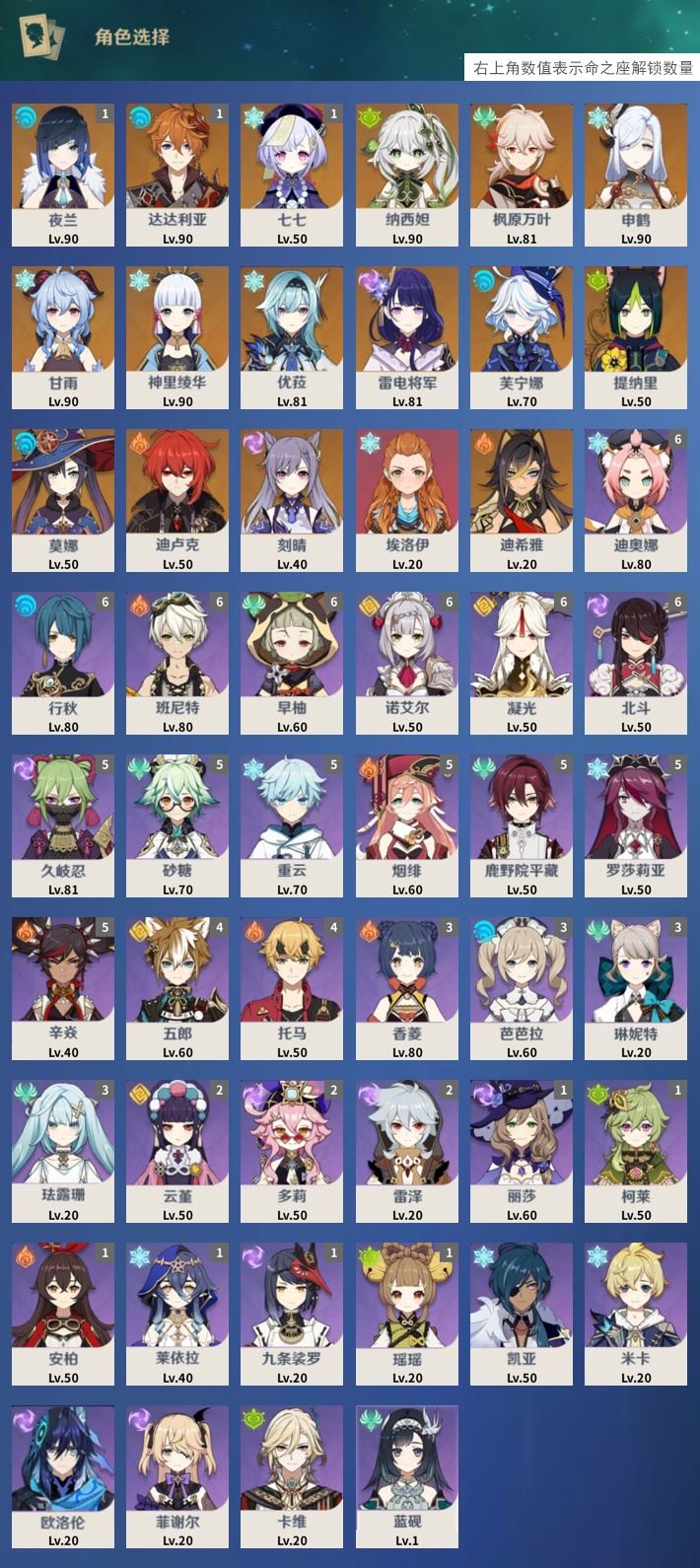 【终身找回包赔】【IXYPNEFG2】58级,31黄,女主,17个五星角色:1命夜兰,1命达达利亚,1命七七,纳西妲,枫原万叶,申鹤,甘雨,神里绫华,优菈,雷电将军,芙宁娜,提纳里,莫娜,迪卢克,刻晴
