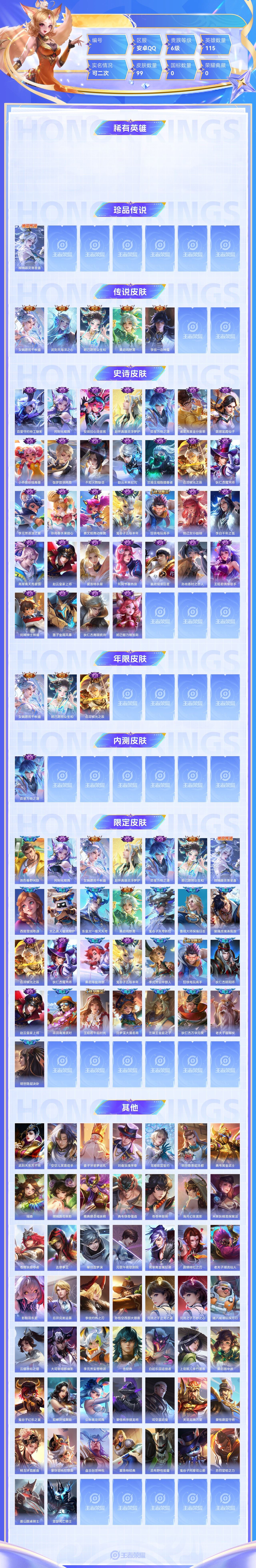 【终身找回包赔】【6460LGEG1】珍品传说1传说5史诗32限定29英雄115皮肤99稀有英雄8贵族6级皮肤价值:62596 【珍品传说1】嫦娥器灵落星盏 【传说皮肤5】女娲愿照千秋盛武则天海洋之心