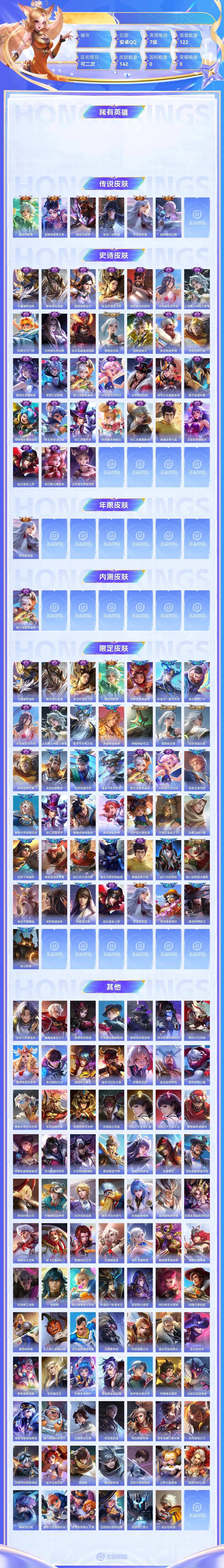 【终身找回包赔】【6J4XO1DED】传说6史诗31限定43英雄122皮肤142稀有英雄9贵族7级皮肤价值:83296 【传说皮肤6】桑启鸣野蒿貂蝉仲夏夜之梦铠绛天战甲李信一念神魔李白凤求凰貂蝉猫影幻