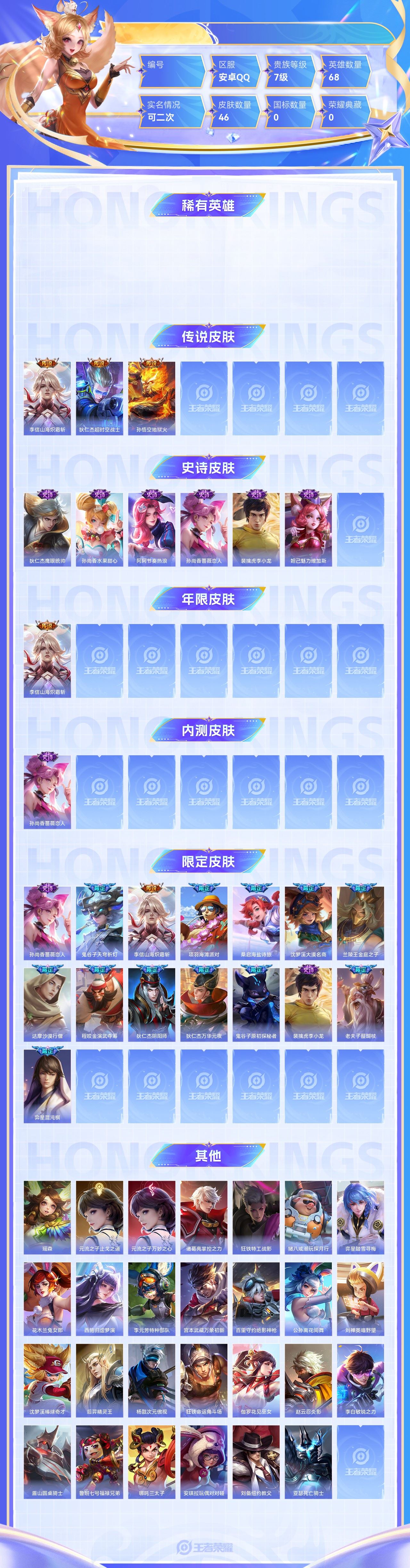 【终身找回包赔】【6J4XOGACE】传说3史诗6限定15英雄68皮肤46稀有英雄3贵族7级皮肤价值:25748 【传说皮肤3】李信山海炽霜斩狄仁杰超时空战士孙悟空地狱火 【史诗皮肤6】狄仁杰鹰眼统帅