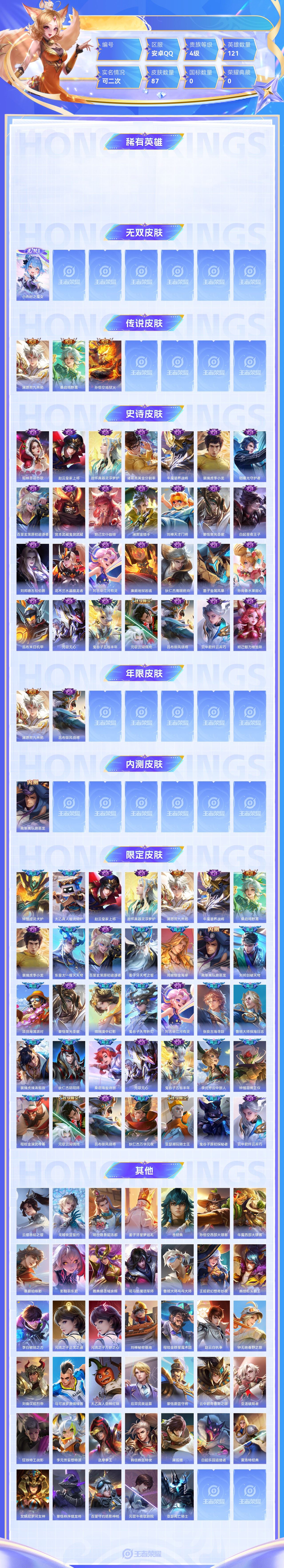 【终身找回包赔】【6RUMMDHDF】无双1传说3史诗28限定35英雄121皮肤87稀有英雄8贵族4级皮肤价值:54040 【无双皮肤1】小乔时之魔女 【传说皮肤3】澜愿照九州拓桑启鸣野蒿孙悟空地狱火