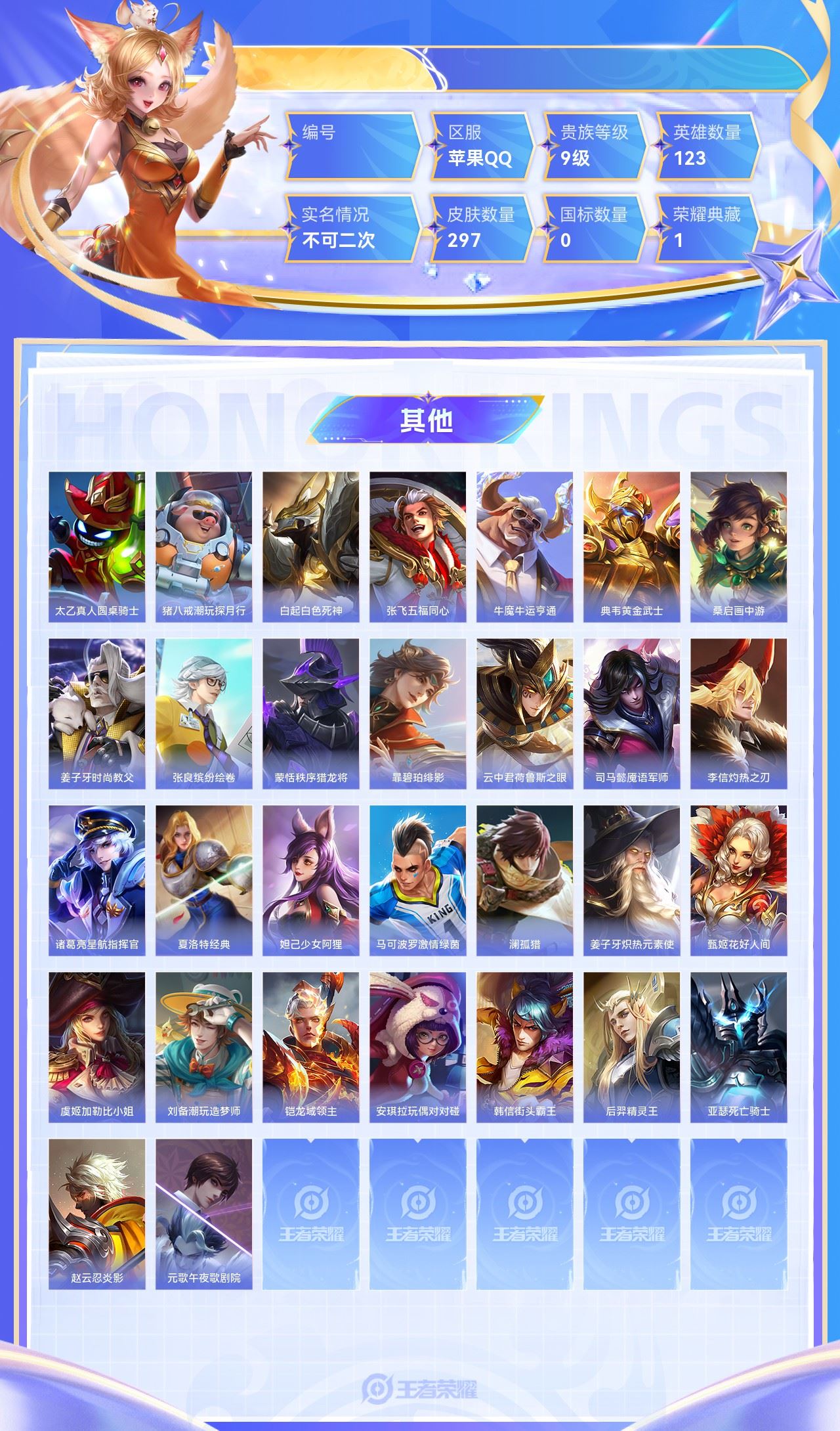 【终身找回包赔】【6RUMMA12D】典藏1传说34史诗88限定77英雄123皮肤297稀有英雄9贵族9级皮肤价值:232740 【荣耀典藏1】韩信弑枪猎影 【传说皮肤34】孙策末日机甲孙策挚爱之约小