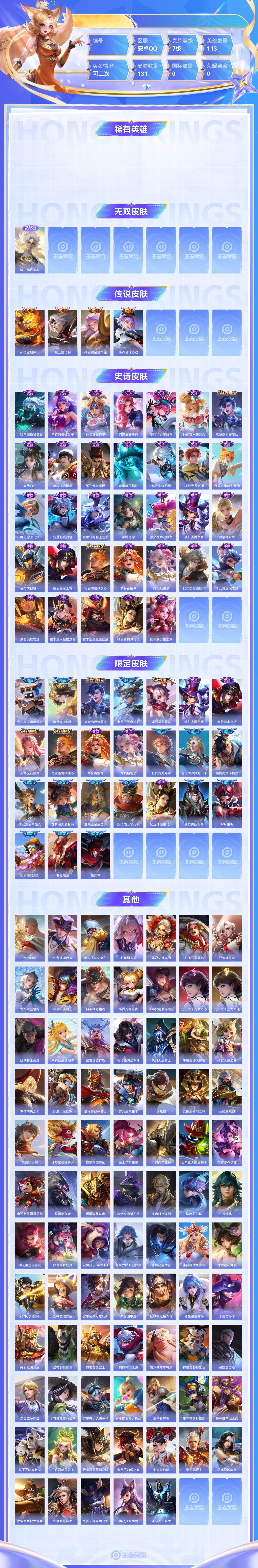 【终身找回包赔】【6P7O9DH1E】无双1传说4史诗33限定24英雄113皮肤131稀有英雄8贵族7级皮肤价值:83224 【无双皮肤1】李白碎月剑心 【传说皮肤4】孙悟空地狱火曜云鹰飞将张良黄金白