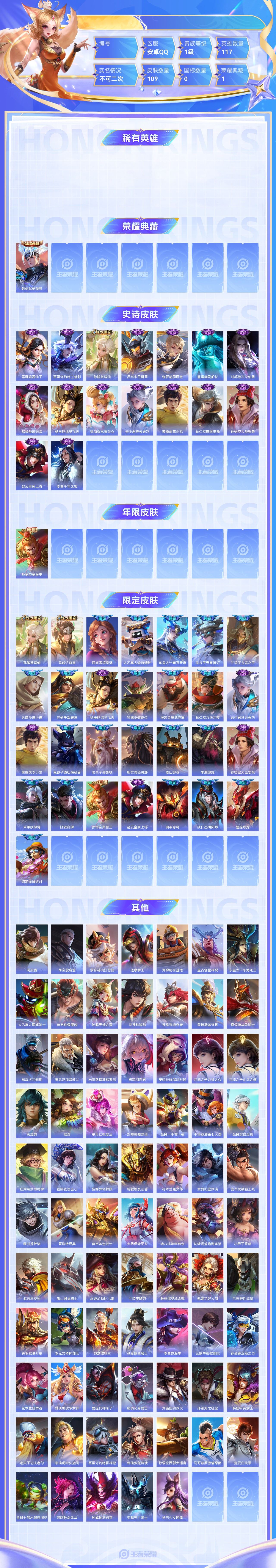 【终身找回包赔】【6Q0QU1CBF】典藏1史诗16限定29英雄117皮肤109稀有英雄8贵族1级皮肤价值:70892 【荣耀典藏1】韩信弑枪猎影 【史诗皮肤16】露娜紫霞仙子百里守约特工魅影孙膑茶境