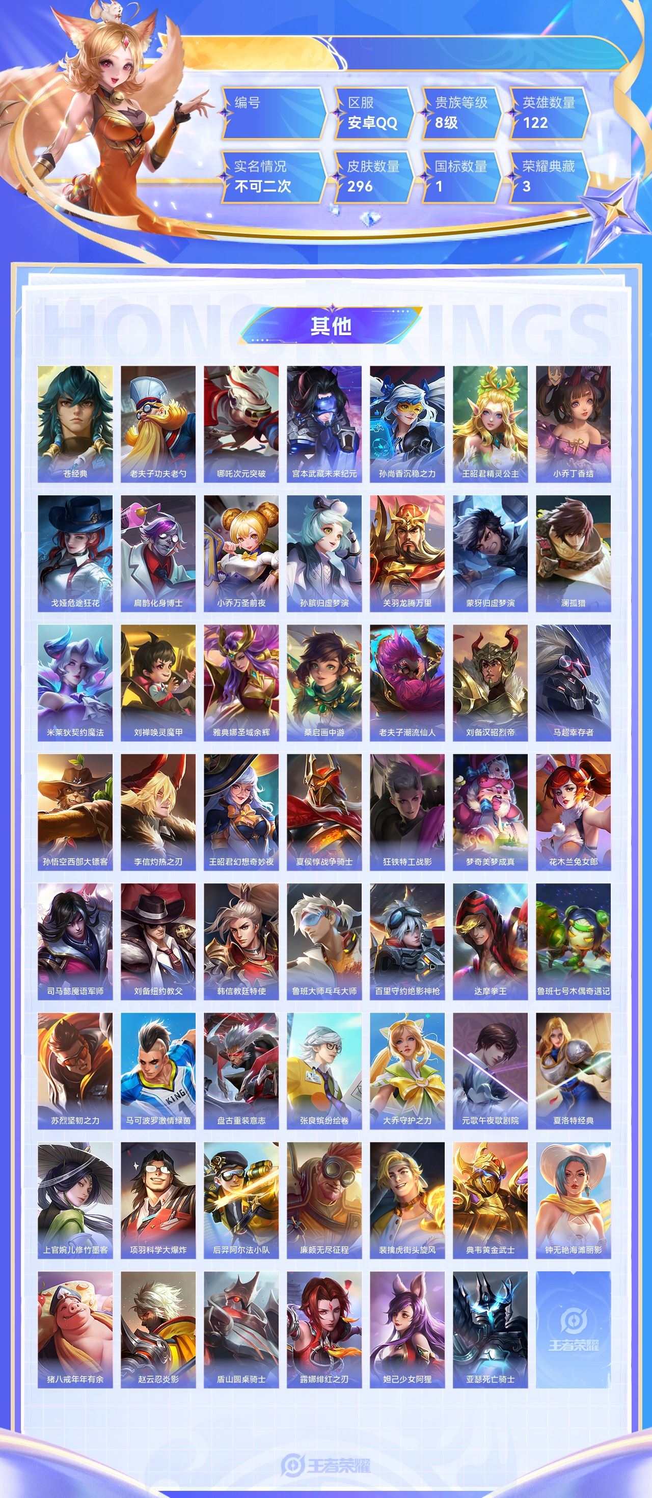 【终身找回包赔】【675Q4FBAC】典藏3传说16史诗102限定109英雄122皮肤296稀有英雄9贵族8级皮肤价值:271654 【大国标0】 【小国标1】国服东皇太一 【荣耀典藏3】韩信弑枪猎影