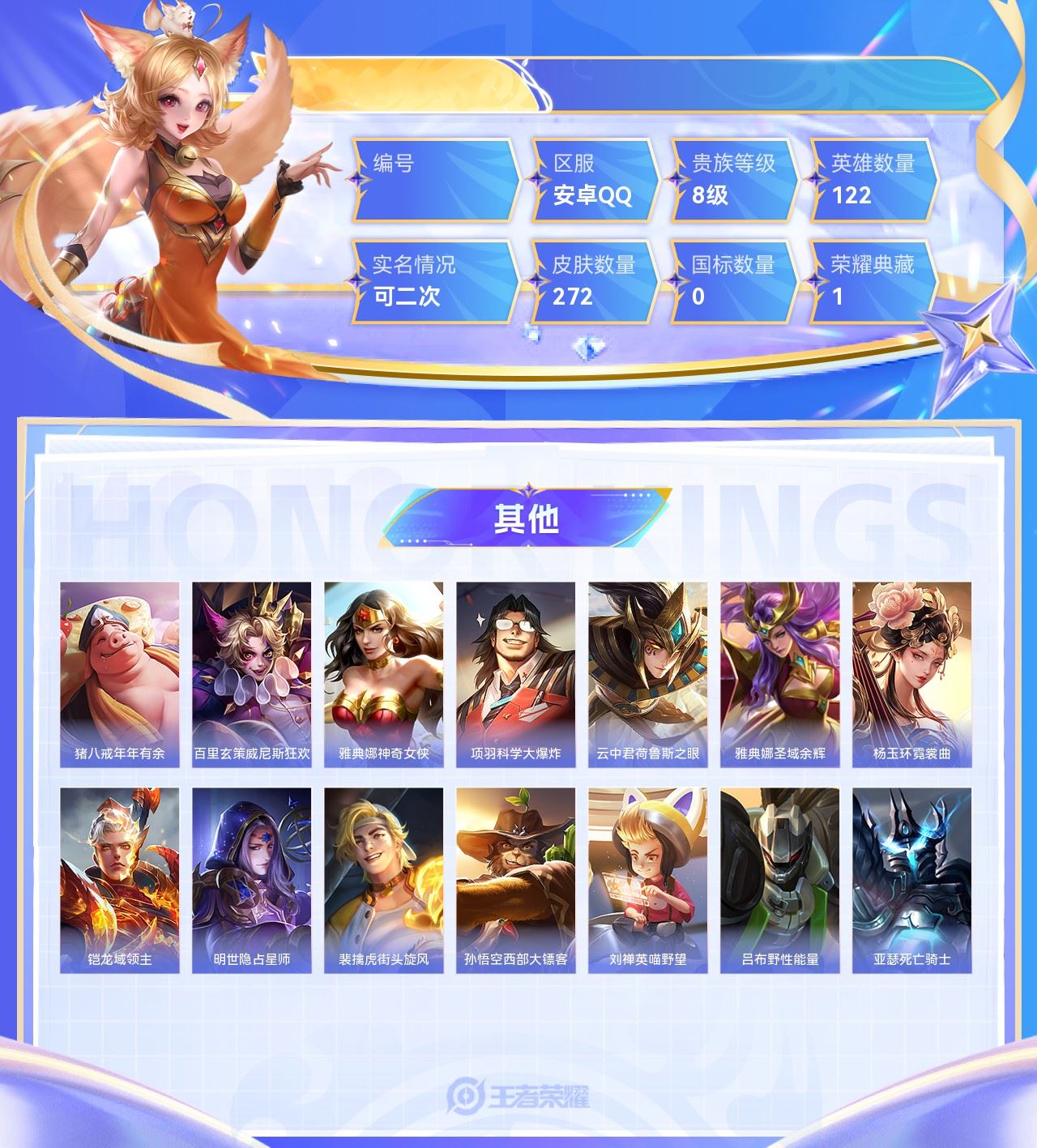【终身找回包赔】【6SPRO2FEA】典藏1传说23史诗84限定101英雄122皮肤272稀有英雄9贵族8级皮肤价值:216440 【荣耀典藏1】孙悟空全息碎影 【传说皮肤23】云缨幻光神枪澜愿照九州