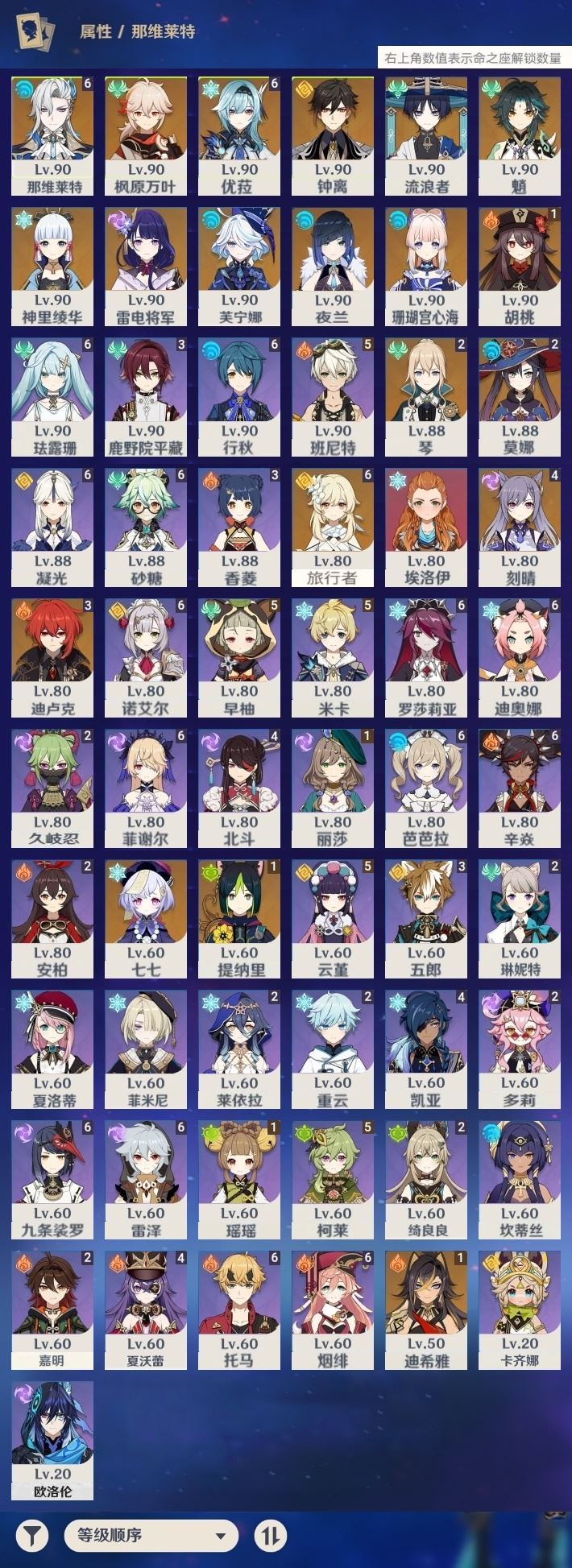 【终身找回包赔】【IK5MPAAFG】60级,60黄,女主,19个五星角色:满命那维莱特,满命优菈,4命刻晴,3命迪卢克,2命琴,2命莫娜,1命胡桃,1命提纳里,1命迪希雅,枫原万叶,钟离,流浪者,魈