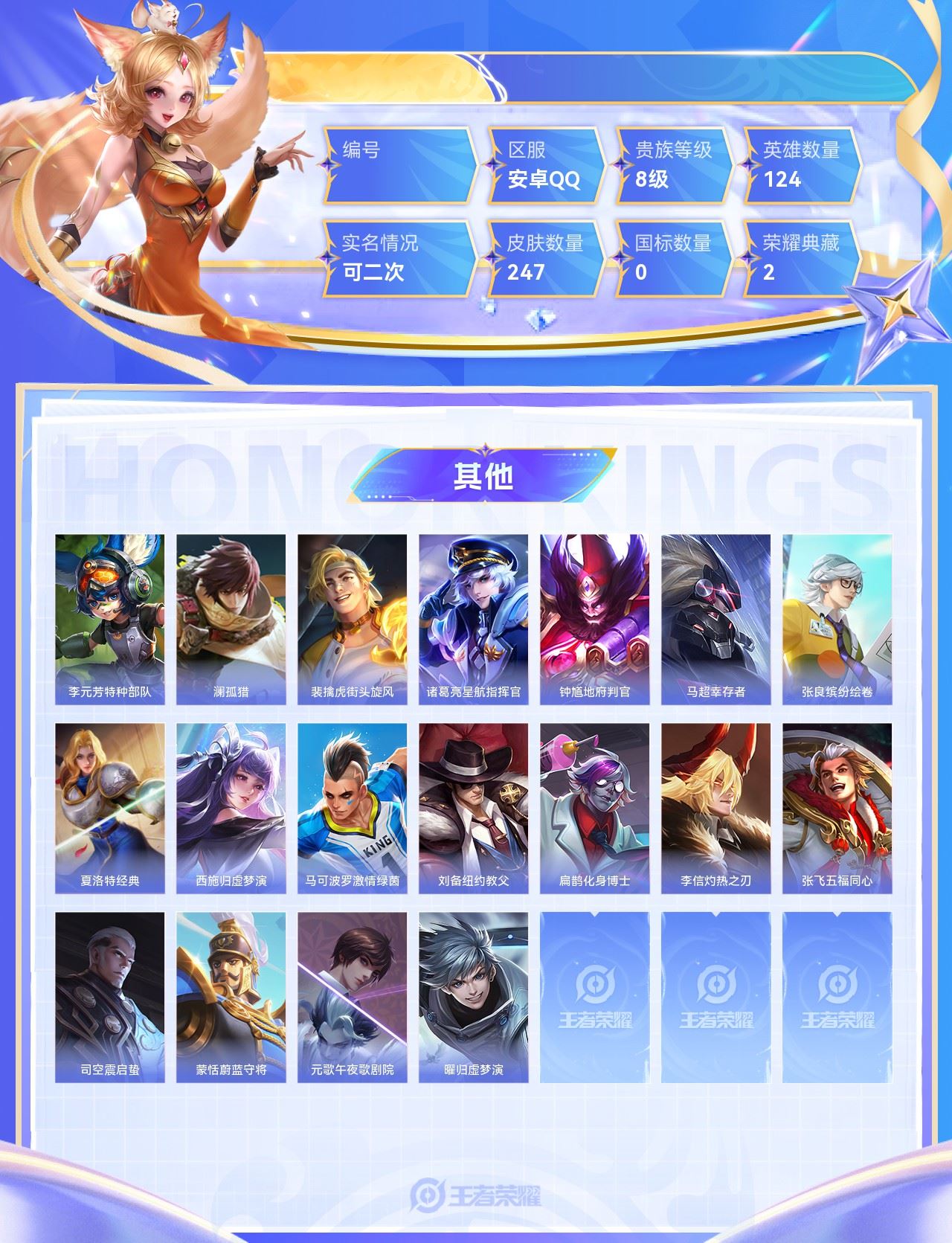 【终身找回包赔】【6XJTV2HGA】珍品传说1无双2典藏2传说25史诗81限定90英雄124皮肤247稀有英雄9贵族8级皮肤价值:226944 【珍品传说1】孙策时之奇旅 【无双皮肤2】小乔时之魔女