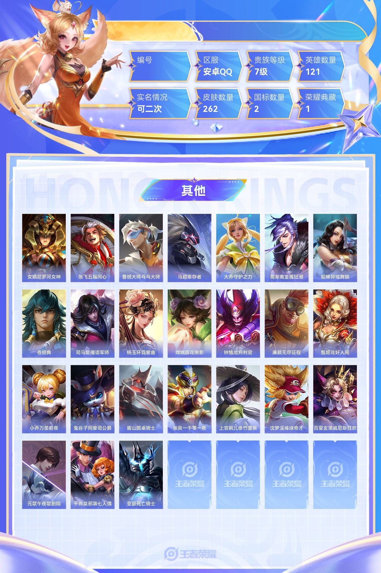 【终身找回包赔】【6XJTVGGEB】珍品传说2无双3典藏1传说15史诗69限定87英雄121皮肤262稀有英雄8贵族7级皮肤价值:187504 【大国标0】 【小国标2】国服金蝉国服张良 【珍品传说