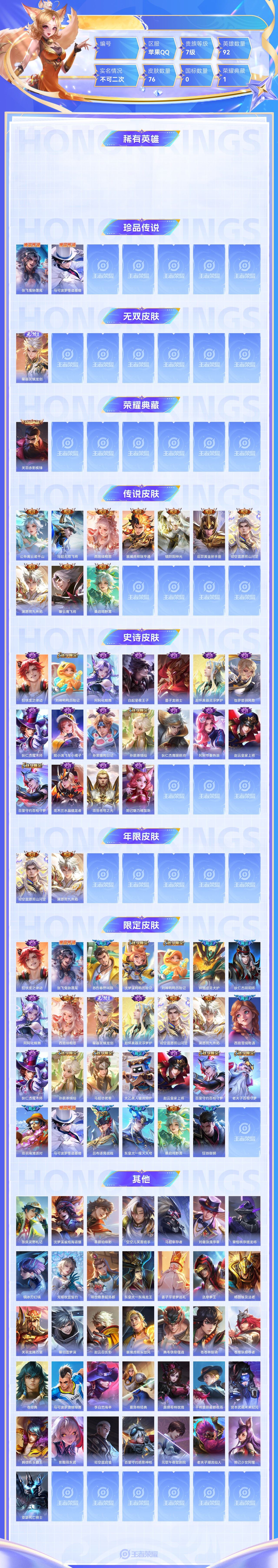 【终身找回包赔】【6XJTVG2AE】珍品传说2无双1典藏1传说10史诗18限定27英雄92皮肤76稀有英雄6贵族7级皮肤价值:76336 【珍品传说2】张飞兔狲蓬尾马可波罗怪盗基德 【无双皮肤1】曜