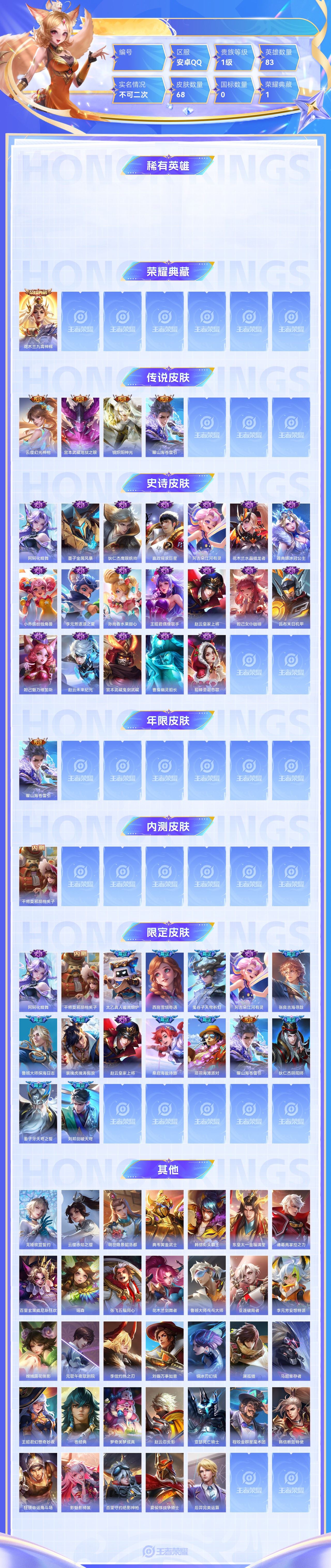 【终身找回包赔】【60RIL2HEC】典藏1传说4史诗19限定16英雄83皮肤68稀有英雄3贵族1级皮肤价值:63296 【荣耀典藏1】花木兰九霄神辉 【传说皮肤4】云缨幻光神枪宫本武藏地狱之眼镜炽阳