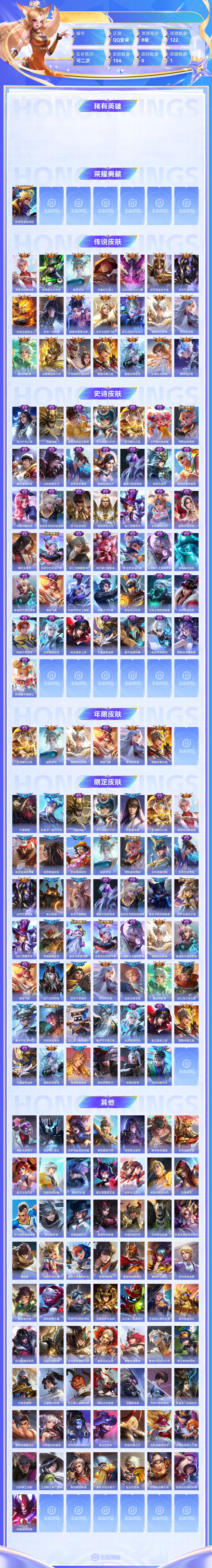 【终身找回包赔】【63MST2CGC】典藏1传说21史诗43限定48英雄122皮肤154稀有英雄9贵族8级皮肤价值:134656 【荣耀典藏1】孙悟空全息碎影 【传说皮肤21】诸葛亮武陵仙君孙尚香末日