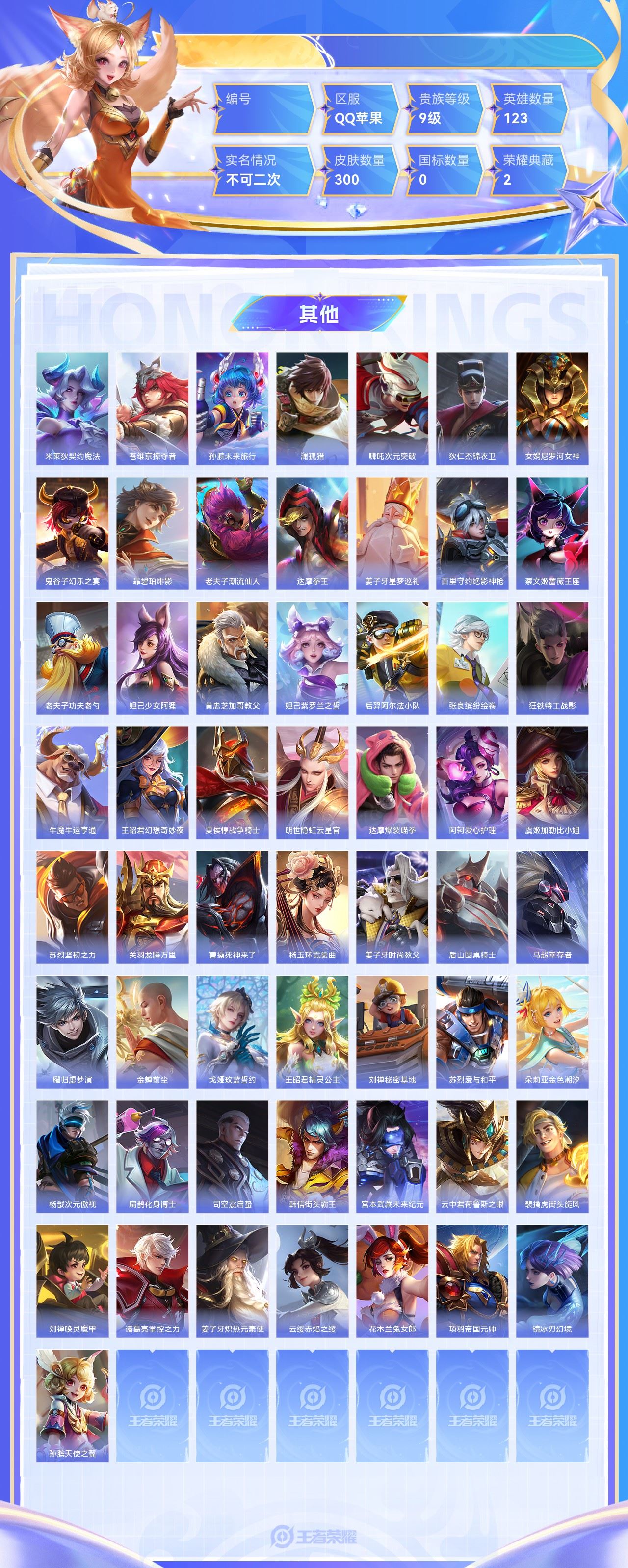【终身找回包赔】【63MSTBF1E】珍品传说2典藏2传说28史诗95限定124英雄123皮肤300稀有英雄9贵族9级皮肤价值:262090 【珍品传说2】马可波罗怪盗基德鲁班七号江户川柯南 【荣耀典