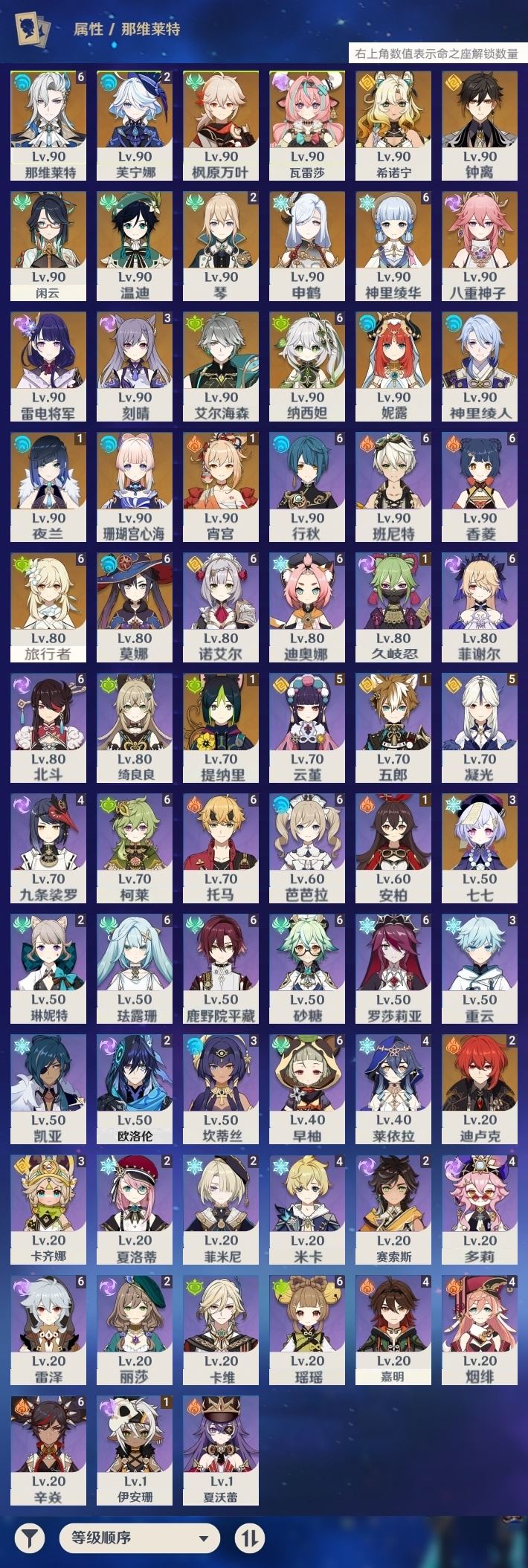 【终身找回包赔】【IOVOTFA1C】60级,81黄,女主,25个五星角色:满命那维莱特,满命神里绫华,满命纳西妲,满命莫娜,3命刻晴,3命七七,2命芙宁娜,2命琴,2命迪卢克,1命夜兰,1命宵宫,1