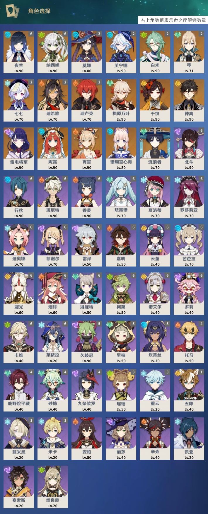 【终身找回包赔】【IIMSWECEE】59级,59黄,女主,17个五星角色:满命夜兰,满命纳西妲,3命莫娜,2命芙宁娜,2命白术,2命琴,2命七七,2命迪希雅,2命迪卢克,枫原万叶,千织,钟离,雷电将