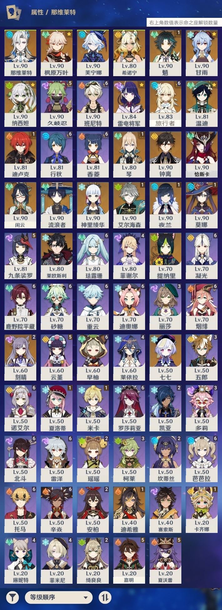 【终身找回包赔】【IOVOT2FH1】60级,44黄,女主,24个五星角色:2命刻晴,1命魈,1命迪卢克,1命琴,1命艾尔海森,1命夜兰,1命莫娜,1命迪希雅,那维莱特,枫原万叶,芙宁娜,希诺宁,甘雨