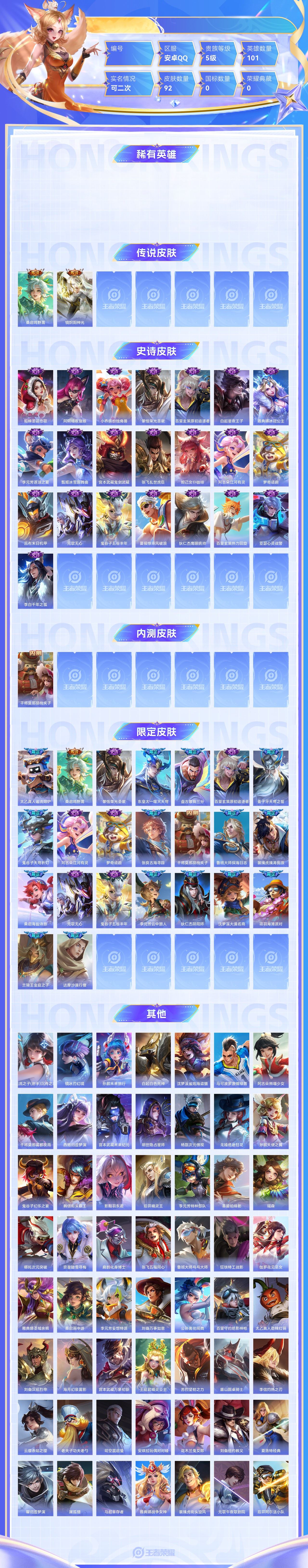 【终身找回包赔】【6ZLZKB2DG】传说2史诗22限定23英雄101皮肤92稀有英雄5贵族5级皮肤价值:53888 【传说皮肤2】桑启鸣野蒿镜炽阳神光 【史诗皮肤22】貂蝉圣诞恋歌阿轲暗夜猫娘小乔缤