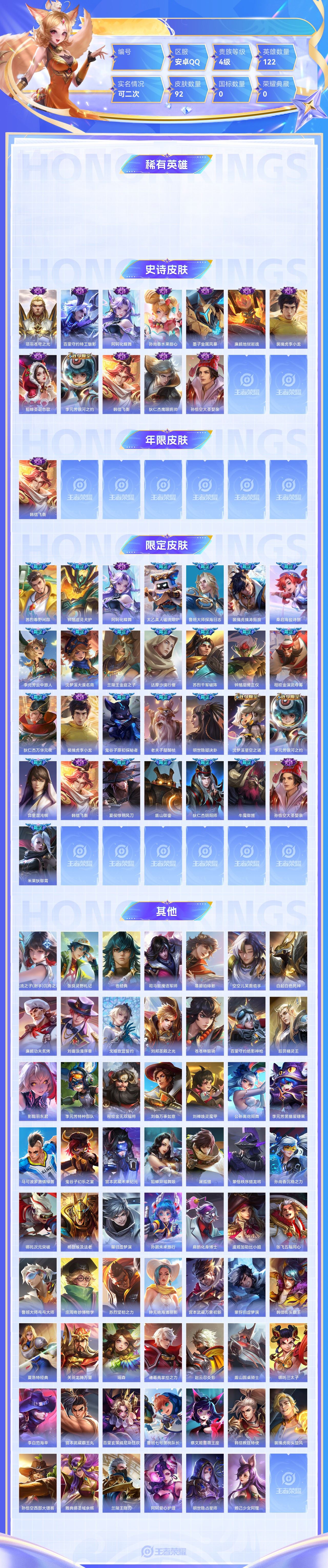 【终身找回包赔】【6N6WNGE1A】史诗12限定29英雄122皮肤92稀有英雄8贵族4级皮肤价值:47568 【史诗皮肤12】项羽苍穹之光百里守约特工魅影阿轲化蝶舞孙尚香水果甜心墨子金属风暴廉颇地狱