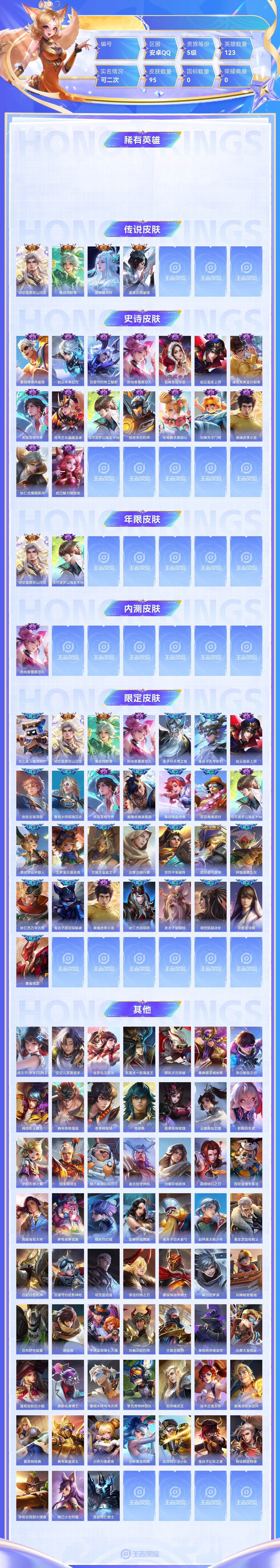 【终身找回包赔】【66MN3HEHH】传说4史诗16限定29英雄123皮肤95稀有英雄9贵族5级皮肤价值:53952 【传说皮肤4】司空震愿照山河定桑启鸣野蒿露娜霜月吟虞姬云霓雀翎 【史诗皮肤16】夏