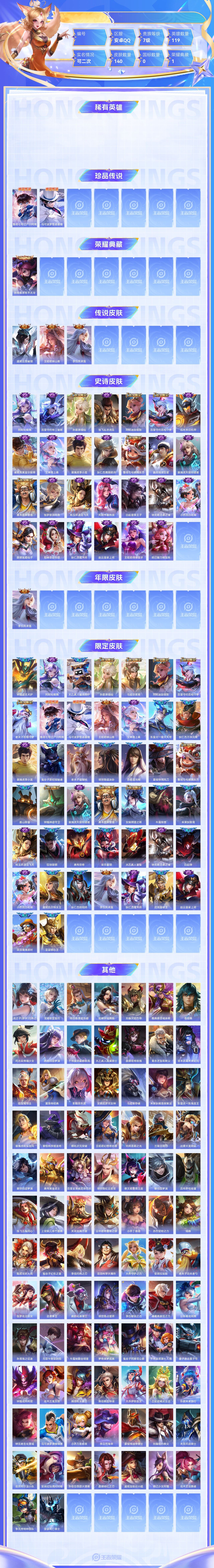【终身找回包赔】【66MN31BBA】珍品传说2典藏1传说3史诗27限定44英雄119皮肤140稀有英雄9贵族7级皮肤价值:92172 【珍品传说2】鲁班七号江户川柯南马可波罗怪盗基德 【荣耀典藏1】