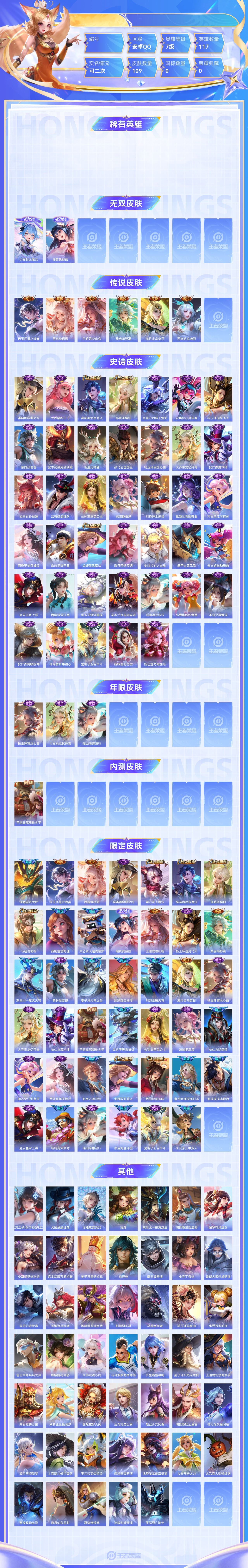 【终身找回包赔】【66MN31BF2】无双2传说6史诗40限定41英雄117皮肤109稀有英雄6贵族7级皮肤价值:81428 【无双皮肤2】小乔时之魔女瑶真我赫兹 【传说皮肤6】杨玉环星之鸣奏西施续相