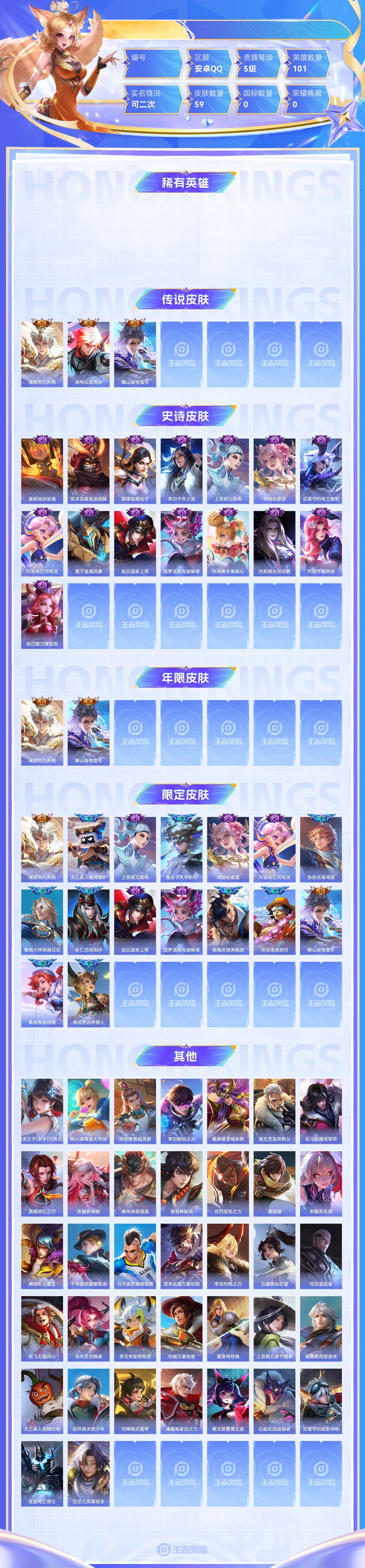 【终身找回包赔】【66MN3BAAD】传说3史诗15限定16英雄101皮肤59稀有英雄5贵族5级皮肤价值:45304 【传说皮肤3】澜愿照九州拓澜电玩雷克斯曜山海苍雷引 【史诗皮肤15】廉颇地狱岩魂宫