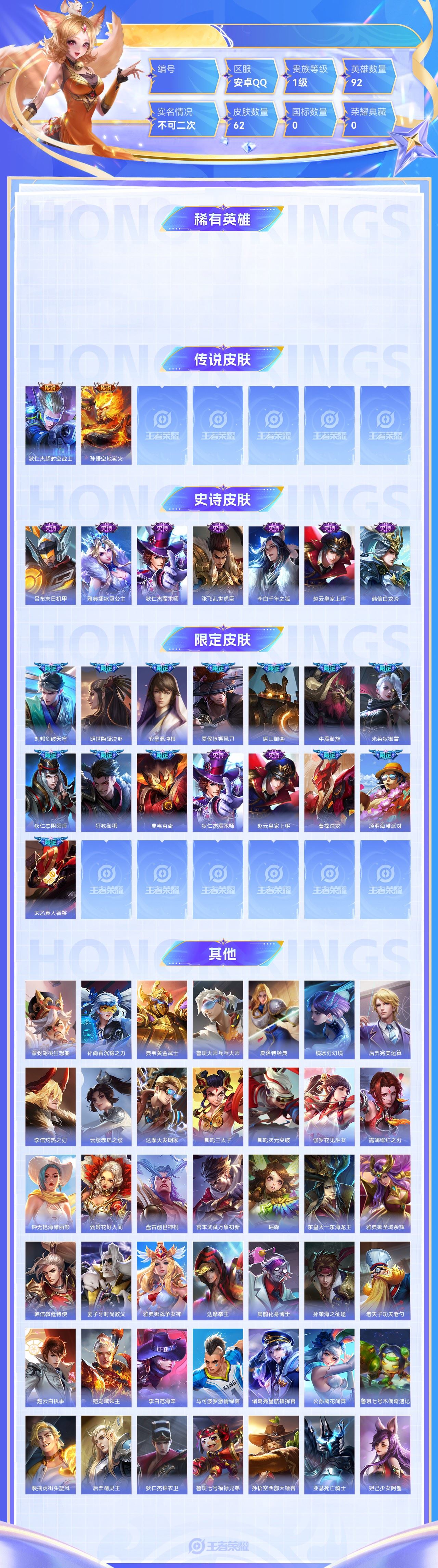 【终身找回包赔】【65LIQECFG】传说2史诗7限定15英雄92皮肤62稀有英雄4贵族1级皮肤价值:30828 【传说皮肤2】狄仁杰超时空战士孙悟空地狱火 【史诗皮肤7】吕布末日机甲雅典娜冰冠公主狄