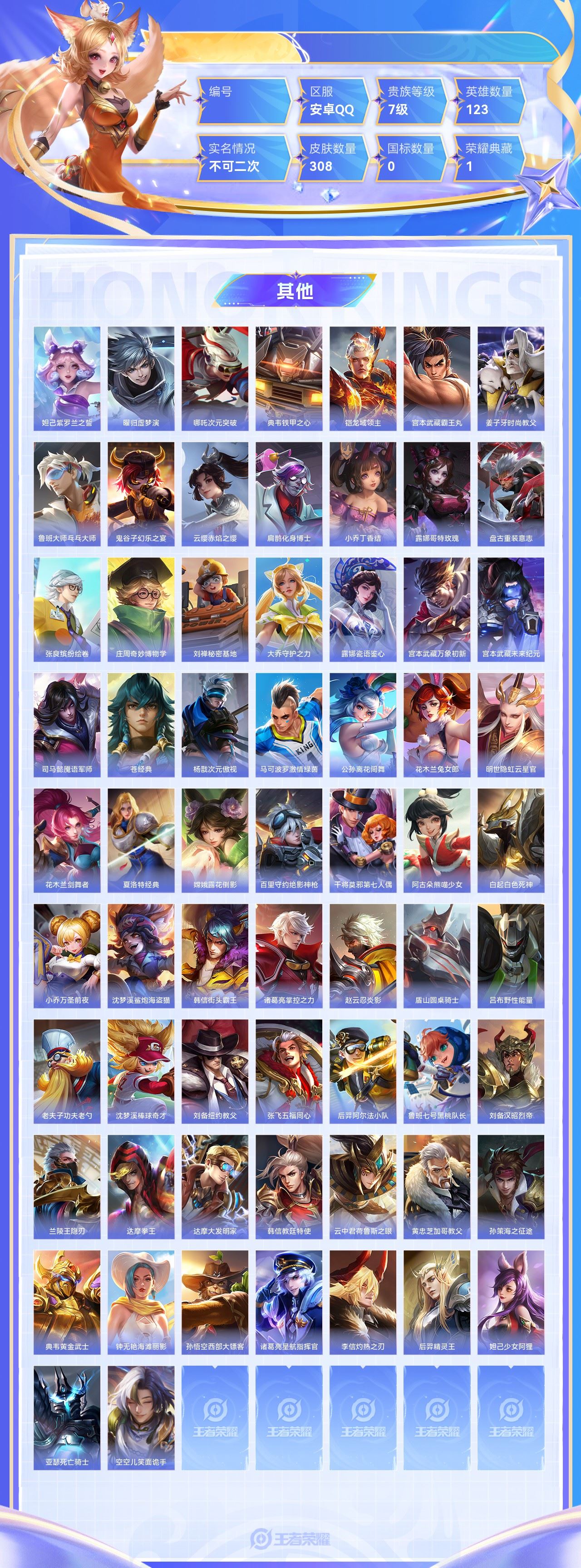 【终身找回包赔】【65LIQCEEC】无双1典藏1传说16史诗96限定110英雄123皮肤308稀有英雄9贵族7级皮肤价值:233020 【无双皮肤1】韩信群星魔术团 【荣耀典藏1】李白鸣剑曳影 【传