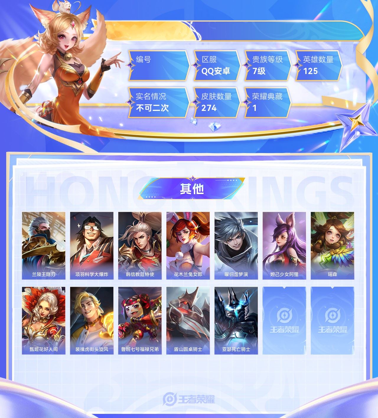 【终身找回包赔】【5级铭文数量0 召唤师等级0 白银Ⅰ 贵族V0】【终身找回包赔】【6QYQIBEAC】无双1典藏1传说11史诗71限定74英雄125皮肤274稀有英雄9贵族7级总场次10504皮肤价值:193006 【无双皮肤1】曜器灵螭龙剑 【荣耀典藏1】李白鸣