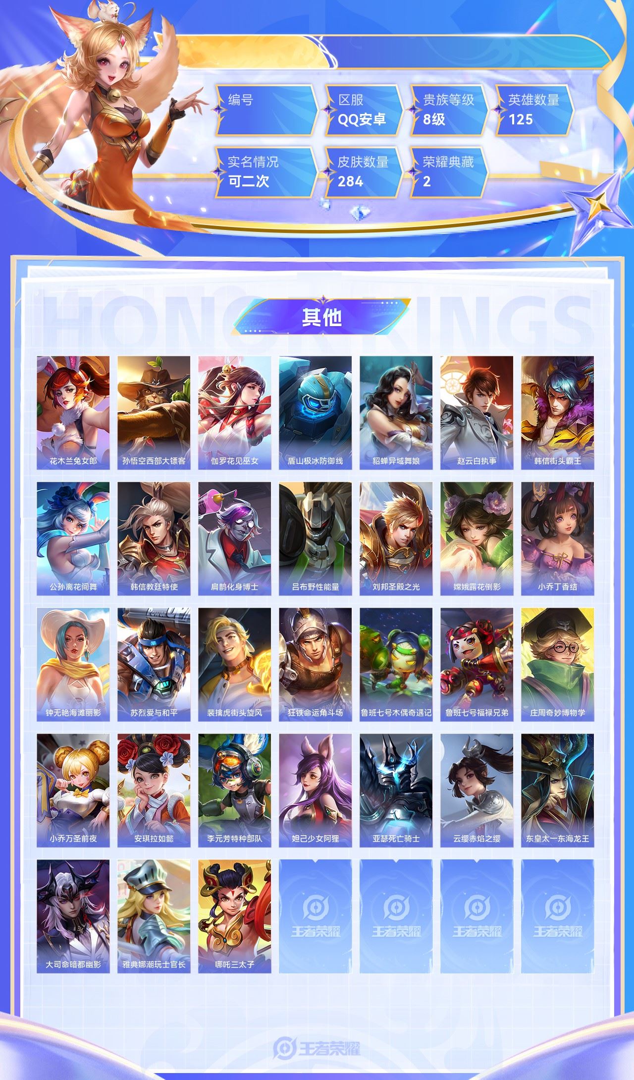 【终身找回包赔】【5级铭文数量0 召唤师等级0 白银Ⅰ 贵族V0】【终身找回包赔】【6QYQIFB21】珍品传说1典藏2传说25史诗76限定89英雄125皮肤284稀有英雄9贵族8级总场次7311皮肤价值:226580 【珍品传说1】宫本武藏黑崎一护 【荣耀典藏2】
