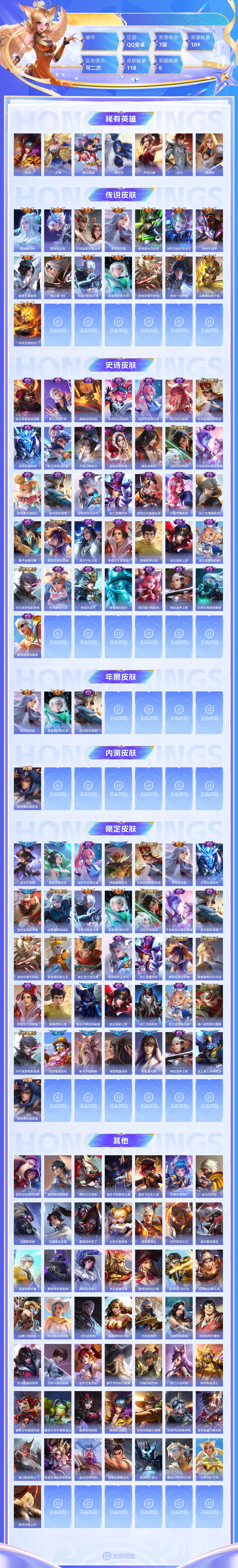【终身找回包赔】【5级铭文数量0 召唤师等级0 白银Ⅰ 贵族V0】【终身找回包赔】【6QYQIAEG2】传说15史诗36限定36英雄109皮肤118稀有英雄7贵族7级总场次4505皮肤价值:85642 【传说皮肤15】露娜霜月吟澜逐花归海干将莫邪久胜战神李白凤求凰孙