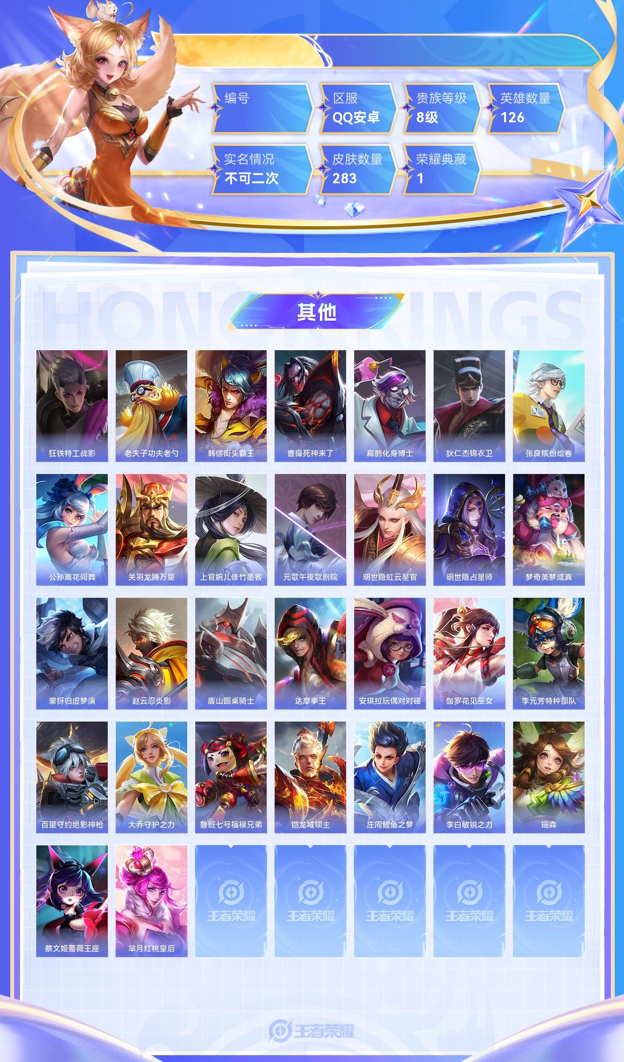 【终身找回包赔】【5级铭文数量0 召唤师等级0 白银Ⅰ 贵族V0】【终身找回包赔】【6QYQIGCCA】珍品传说2典藏1传说21史诗85限定98英雄126皮肤283稀有英雄10贵族8级总场次9149皮肤价值:219144 【珍品传说2】张飞兔狲蓬尾马可波罗怪盗基德