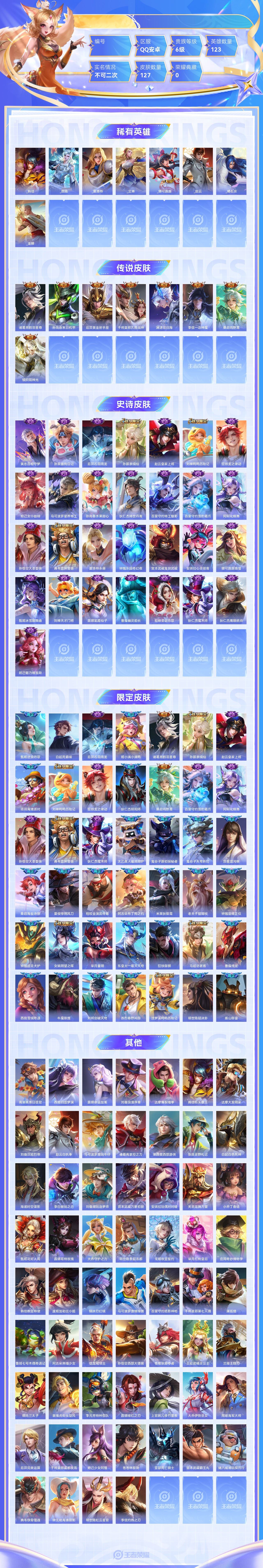 【终身找回包赔】【5级铭文数量0 召唤师等级0 白银Ⅰ 贵族V0】【终身找回包赔】【6QYQIAFFA】传说8史诗29限定42英雄123皮肤127稀有英雄8贵族6级总场次5347皮肤价值:78748 【传说皮肤8】诸葛亮鹤羽星尊孙尚香末日机甲后羿黄金射手座干将莫邪久