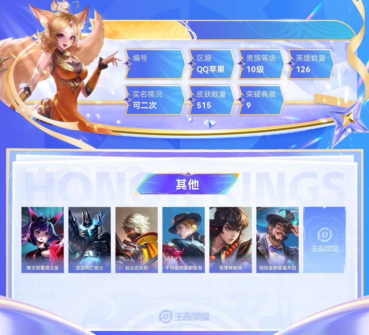 【终身找回包赔】【5级铭文数量0 召唤师等级0 白银Ⅰ 贵族V0】【终身找回包赔】【6QYQIHADB】无双2典藏9传说82史诗187限定204英雄126皮肤515稀有英雄10贵族10级总场次12724皮肤价值:605126 【无双皮肤2】妲己青丘九尾武则天神器明辉