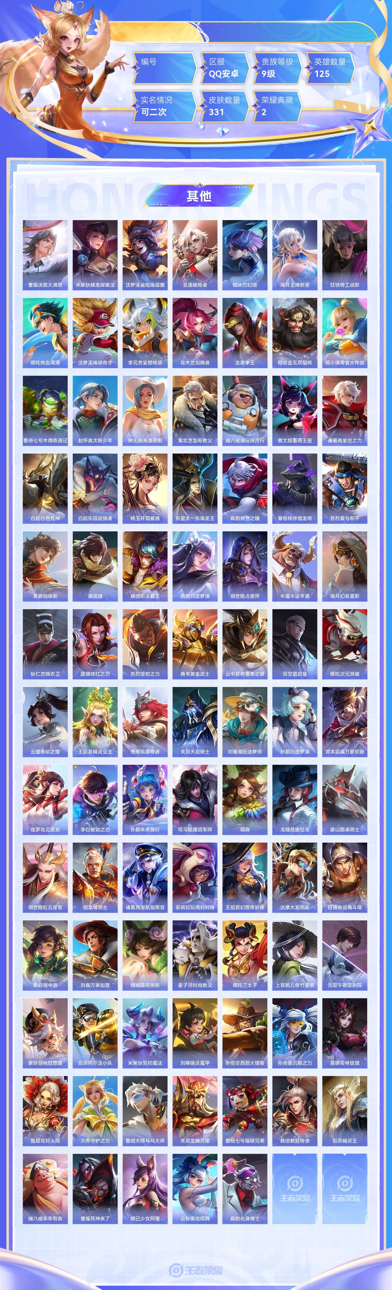 【终身找回包赔】【5级铭文数量0 召唤师等级0 白银Ⅰ 贵族V0】【终身找回包赔】【6QYQICBDD】无双1典藏2传说40史诗84限定95英雄125皮肤331稀有英雄9贵族9级总场次5172皮肤价值:284112 【无双皮肤1】李白碎月剑心 【荣耀典藏2】虞姬神鉴