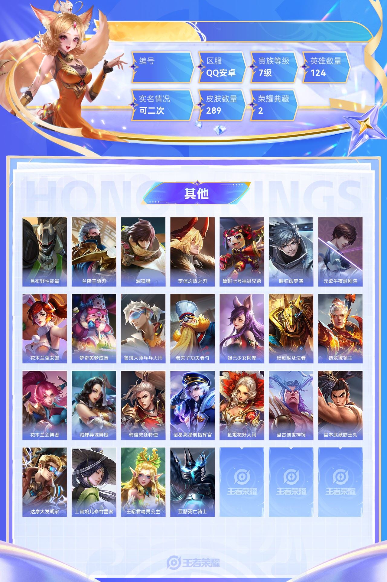 【终身找回包赔】【5级铭文数量0 召唤师等级0 白银Ⅰ 贵族V0】【终身找回包赔】【6QYQIB2AH】典藏2传说11史诗85限定93英雄124皮肤289稀有英雄9贵族7级总场次7852皮肤价值:222720 【荣耀典藏2】花木兰九霄神辉韩信弑枪猎影 【传说皮肤11
