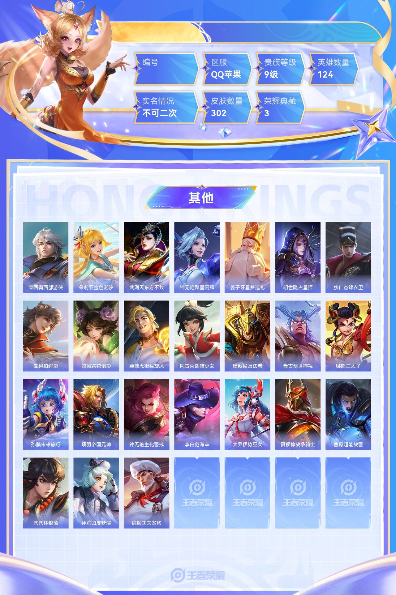 【终身找回包赔】【5级铭文数量0 召唤师等级0 白银Ⅰ 贵族V0】【终身找回包赔】【6ZY0I111E】典藏3传说10史诗84限定91英雄124皮肤302稀有英雄8贵族9级总场次14306皮肤价值:251332 【荣耀典藏3】诸葛亮星域神启李白鸣剑曳影孙悟空全息碎影