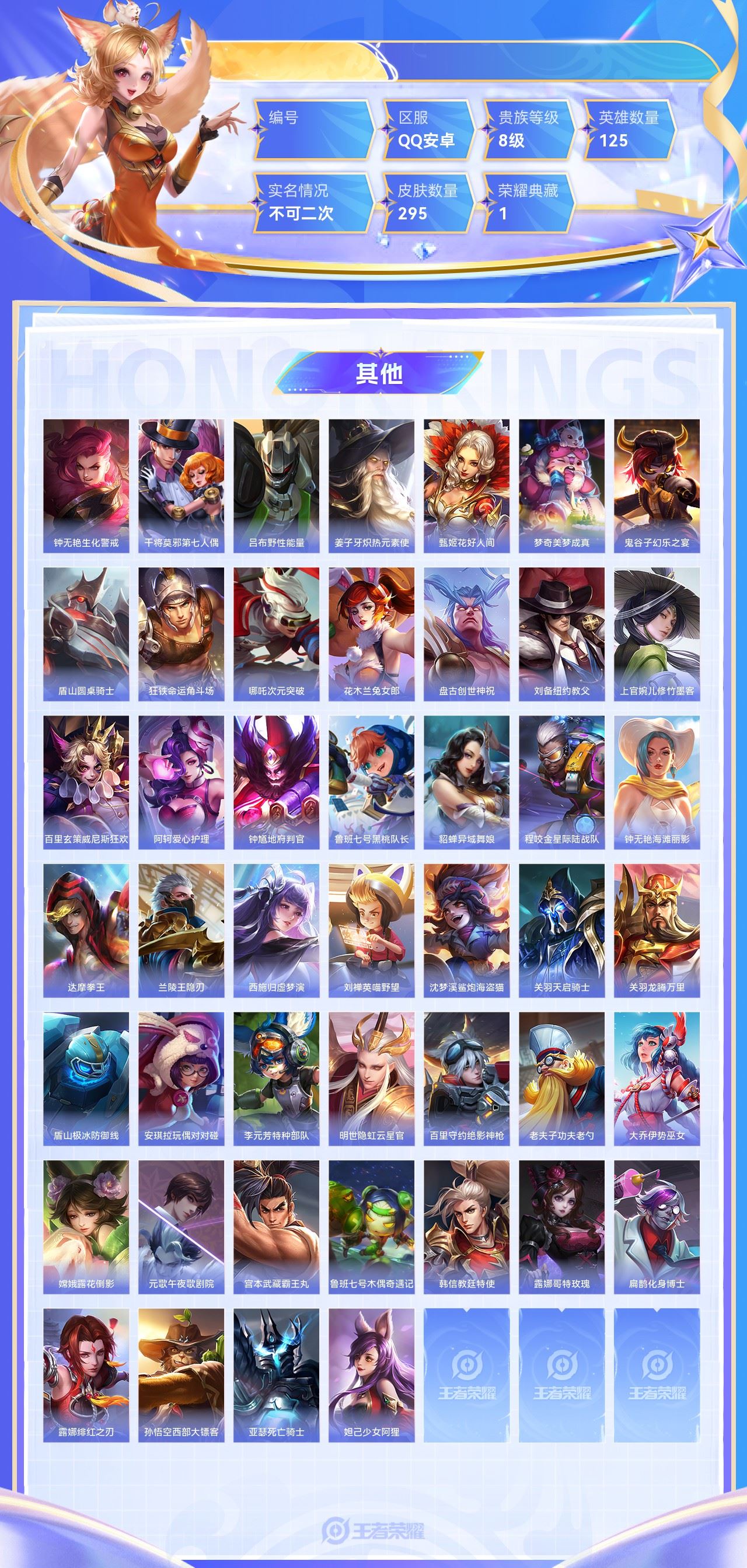 【终身找回包赔】【5级铭文数量0 召唤师等级0 白银Ⅰ 贵族V0】【终身找回包赔】【6ZY0I1BF1】珍品传说4无双1典藏1传说13史诗71限定92英雄125皮肤295稀有英雄9贵族8级总场次10782皮肤价值:196240 【珍品传说4】嫦娥器灵落星盏孙策时之奇