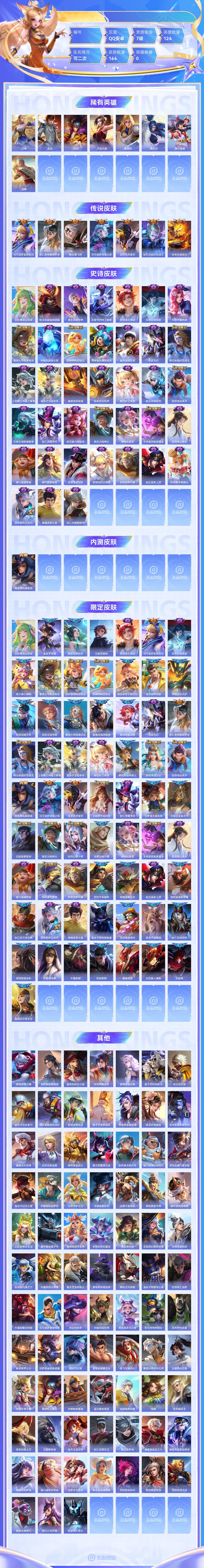 【终身找回包赔】【5级铭文数量0 召唤师等级0 白银Ⅰ 贵族V0】【终身找回包赔】【6PNJ3FHEH】传说7史诗38限定64英雄124皮肤164稀有英雄8贵族7级总场次5089皮肤价值:108360 【传说皮肤7】马可波罗妄想实况狄仁杰神器狴犴令曜云鹰飞将马可波罗