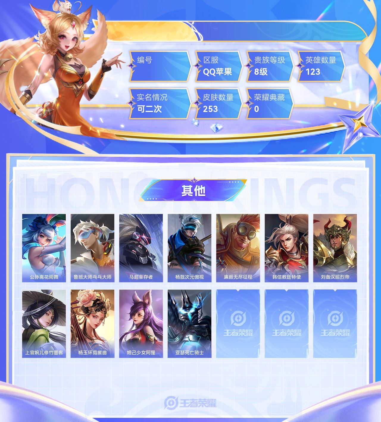 【终身找回包赔】【5级铭文数量0 召唤师等级0 白银Ⅰ 贵族V0】【终身找回包赔】【6PNJ3EB1A】无双1传说24史诗86限定96英雄123皮肤253稀有英雄9贵族8级总场次3910皮肤价值:190368 【无双皮肤1】曜器灵螭龙剑 【传说皮肤24】澜愿照九州拓