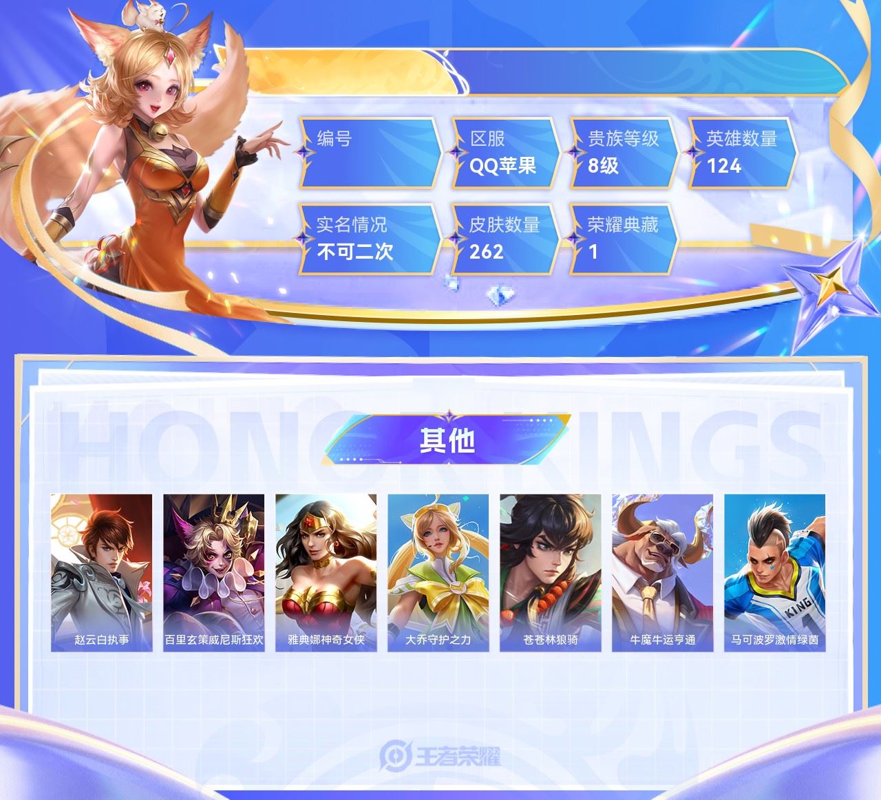 【终身找回包赔】【5级铭文数量0 召唤师等级0 白银Ⅰ 贵族V0】【终身找回包赔】【6PNJ3B2A2】典藏1传说22史诗83限定91英雄124皮肤262稀有英雄8贵族8级总场次11330皮肤价值:209482 【荣耀典藏1】李白鸣剑曳影 【传说皮肤22】桑启鸣野蒿