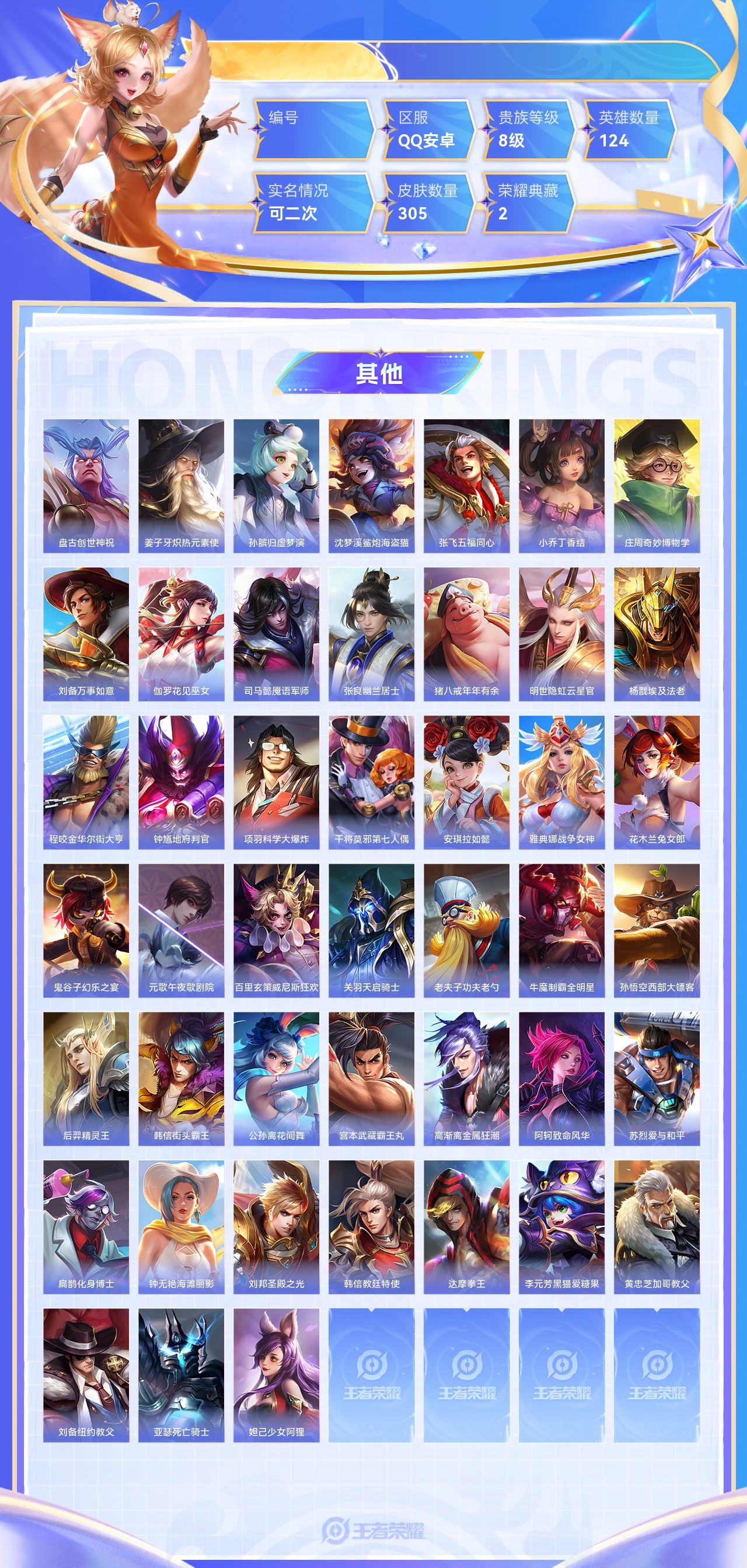 【终身找回包赔】【5级铭文数量0 召唤师等级0 白银Ⅰ 贵族V0】【终身找回包赔】【6PNJ3FCF2】典藏2传说16史诗89限定108英雄124皮肤305稀有英雄8贵族8级总场次12590皮肤价值:234138 【荣耀典藏2】李白鸣剑曳影孙尚香杀手不太冷 【传说皮