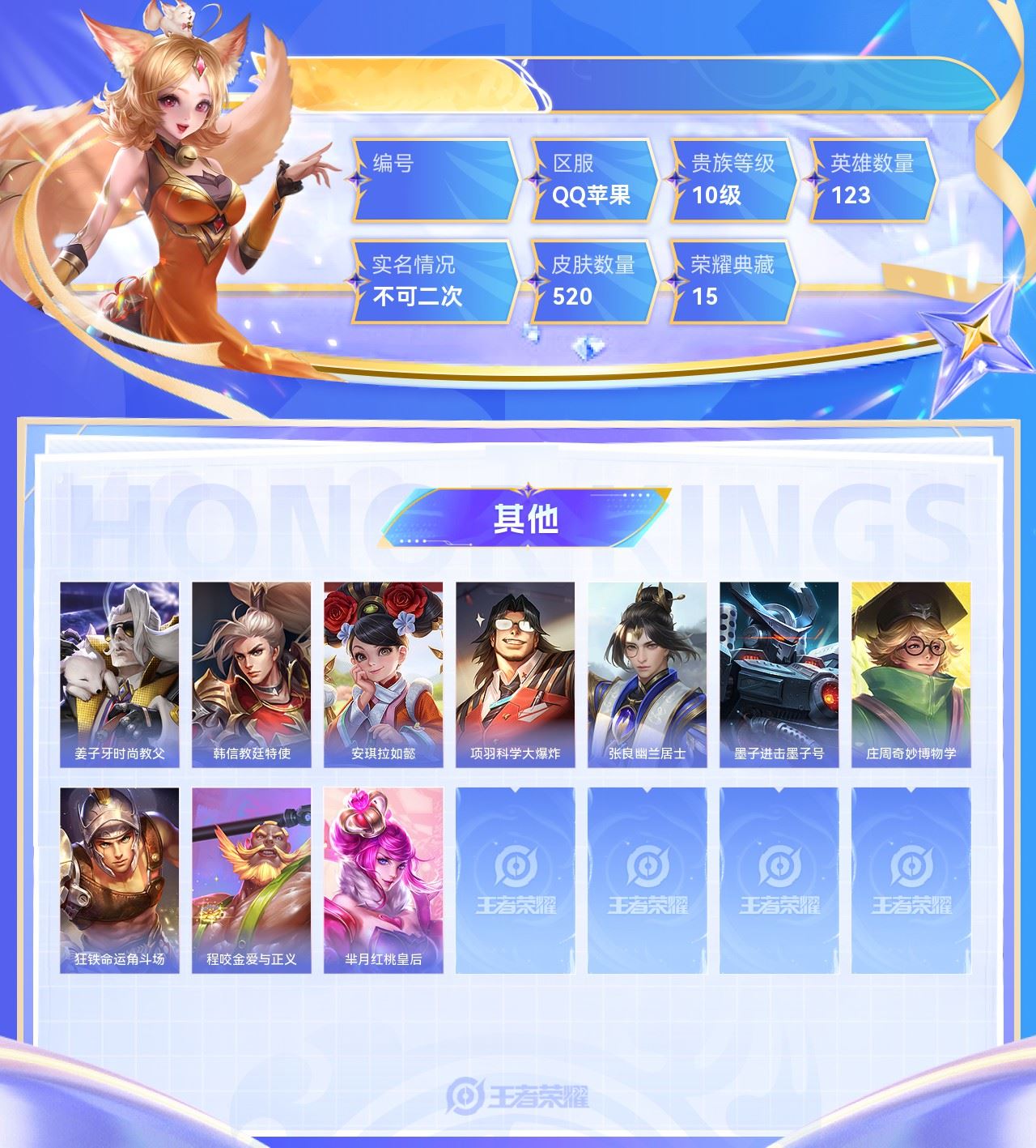 【终身找回包赔】【5级铭文数量0 召唤师等级0 白银Ⅰ 贵族V0】【终身找回包赔】【6PNJ3G2D2】无双2典藏15传说81史诗191限定212英雄123皮肤520稀有英雄9贵族10级总场次13076皮肤价值:723182 【无双皮肤2】妲己青丘九尾武则天神器明辉