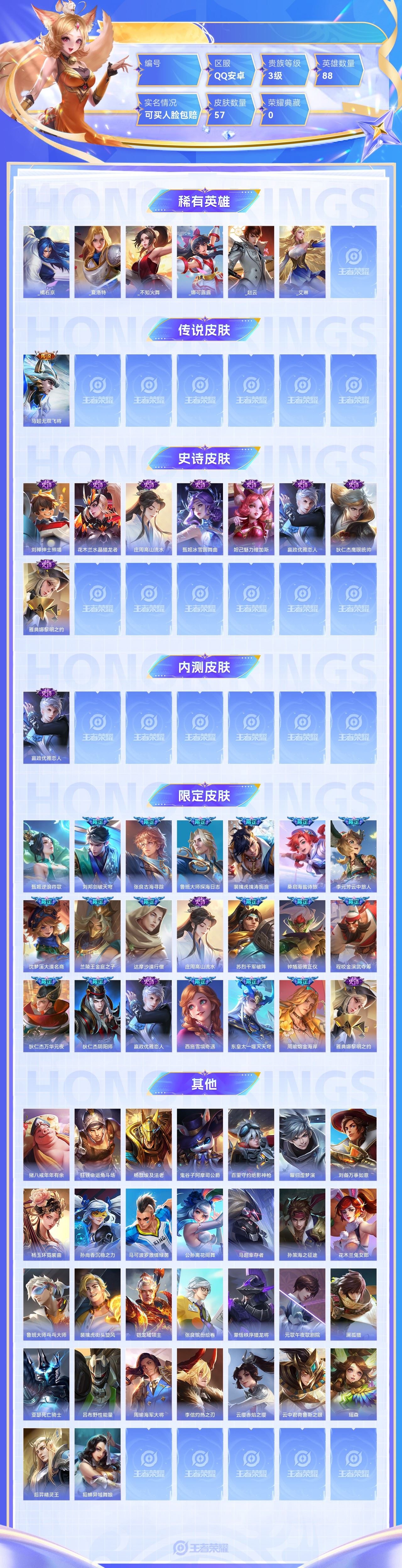 【终身找回包赔】【5级铭文数量0 召唤师等级0 白银Ⅰ 贵族V0】【终身找回包赔】【6PNJ31FAF】传说1史诗8限定21英雄88皮肤57稀有英雄6贵族3级总场次1111皮肤价值:27816 【传说皮肤1】马超无双飞将 【史诗皮肤8】刘禅绅士熊喵花木兰水晶猎龙者庄