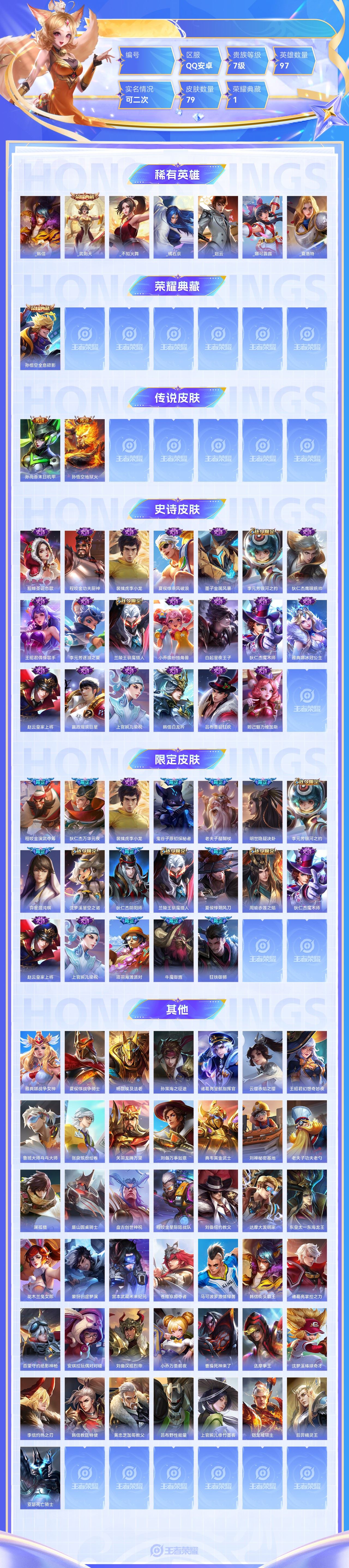 【终身找回包赔】【5级铭文数量0 召唤师等级0 白银Ⅰ 贵族V0】【终身找回包赔】【6PNJ3E1GE】典藏1传说2史诗20限定19英雄97皮肤79稀有英雄7贵族7级总场次2189皮肤价值:66156 【荣耀典藏1】孙悟空全息碎影 【传说皮肤2】孙尚香末日机甲孙悟空