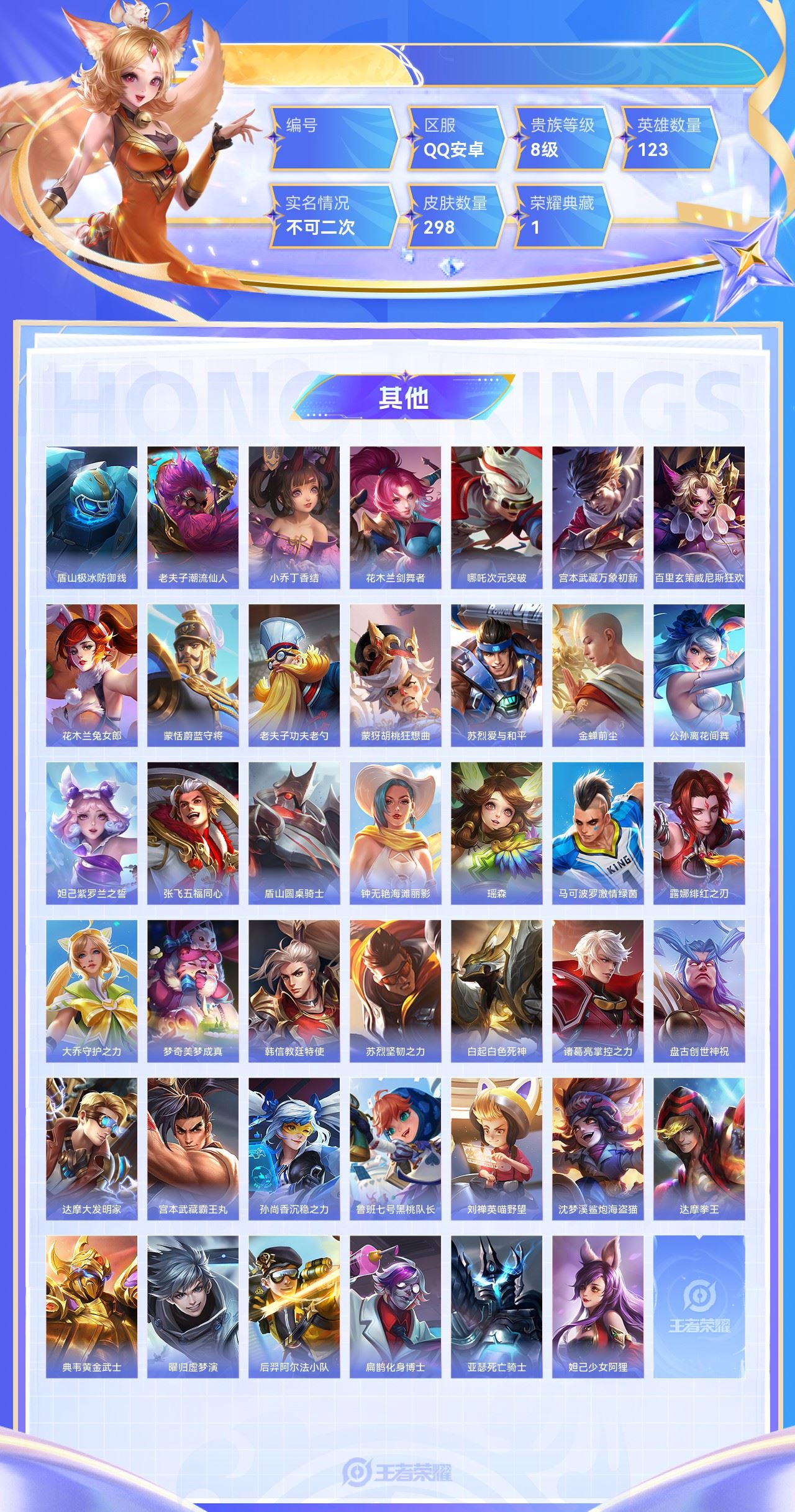 【终身找回包赔】【5级铭文数量0 召唤师等级0 白银Ⅰ 贵族V0】【终身找回包赔】【6PNJ3GDD1】典藏1传说25史诗80限定96英雄123皮肤298稀有英雄8贵族8级总场次9495皮肤价值:217572 【荣耀典藏1】花木兰九霄神辉 【传说皮肤25】诸葛亮鹤羽